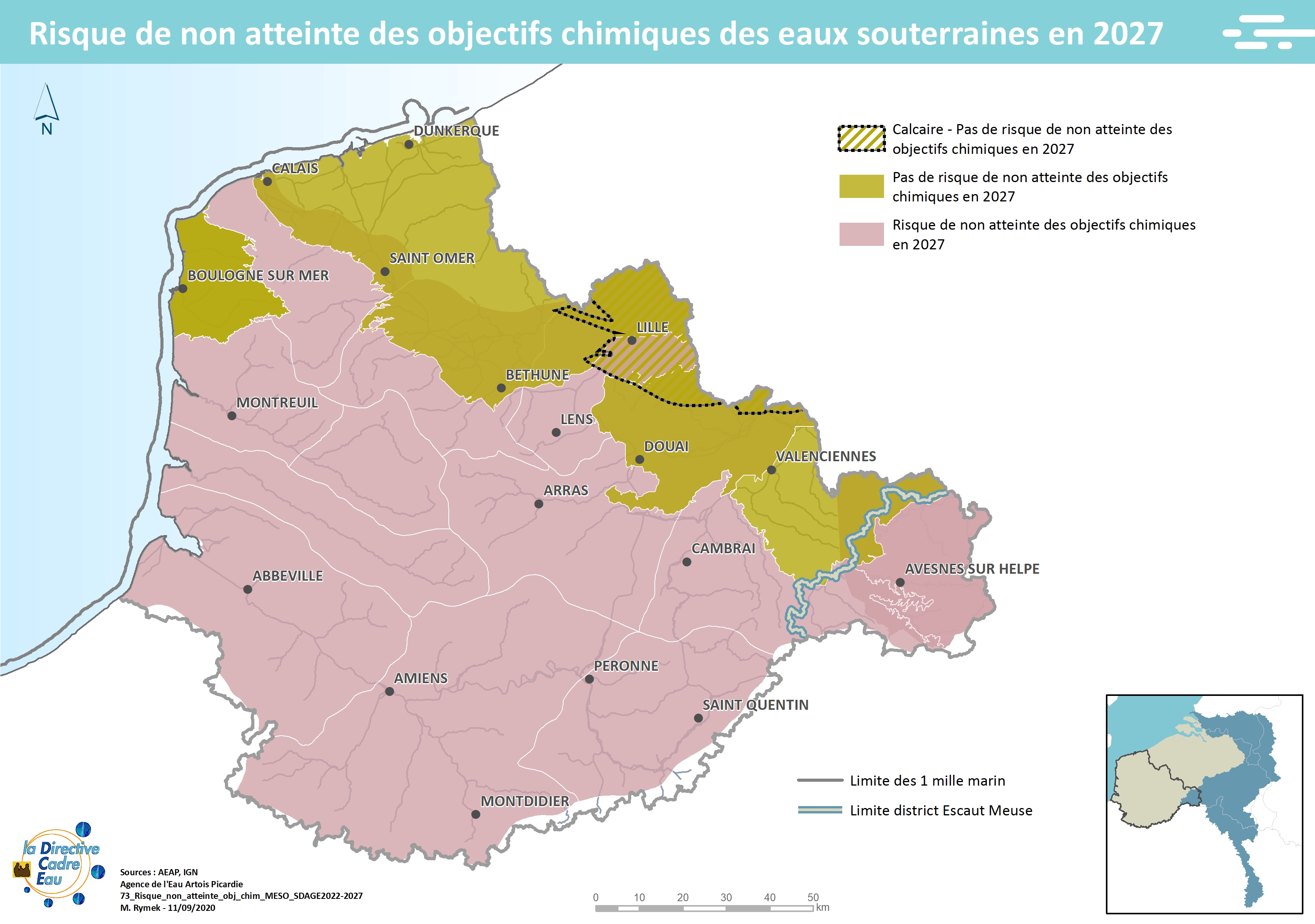 Cette carte issue du SDAGE 2022-2027 présente le risque de non atteinte des objectifs chimiques des eaux souterraines en 2027