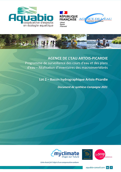 Dans le cadre de la mise en oeuvre de la Directive Cadre Européenne sur l’Eau (DCE), un programme de surveillance a été établi pour suivre la qualité biologique des eaux douces de surface. L’Agence de l’Eau Artois-Picardie a mandaté le bureau d’études AQUABIO concernant l’acquisition, l’analyse et l’interprétation de données hydrobiologiques basées sur le support invertébrés, sur la période 2021-2024.