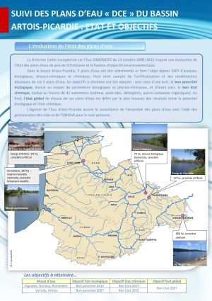Dans le bassin Artois-Picardie, 5 plans d’eau ont été sélectionnés et font l’objet depuis 2007 d’analyses biologiques, physico-chimiques et chimiques. Pour tenir compte de l’artificialisation et des modifications physiques de ces 5 plans d’eau, les objectifs à atteindre ont été adaptés : sont visés d’une part, le bon potentiel écologique, évalué au moyen de paramètres biologiques et physico-chimiques, et d’autre part, le bon état chimique, évalué au travers de 41 substances (métaux, pesticides, détergents, autres composés organiques). Au final, l’état global de chacun de ces plans d’eau est défini par le plus mauvais des résultats entre le potentiel écologique et l’état chimique. L’Agence de l’Eau Artois-Picardie assure la surveillance de l’ensemble des plans d’eau avec l’aide des gestionnaires des sites et de l’ONEMA pour le suivi poissons.