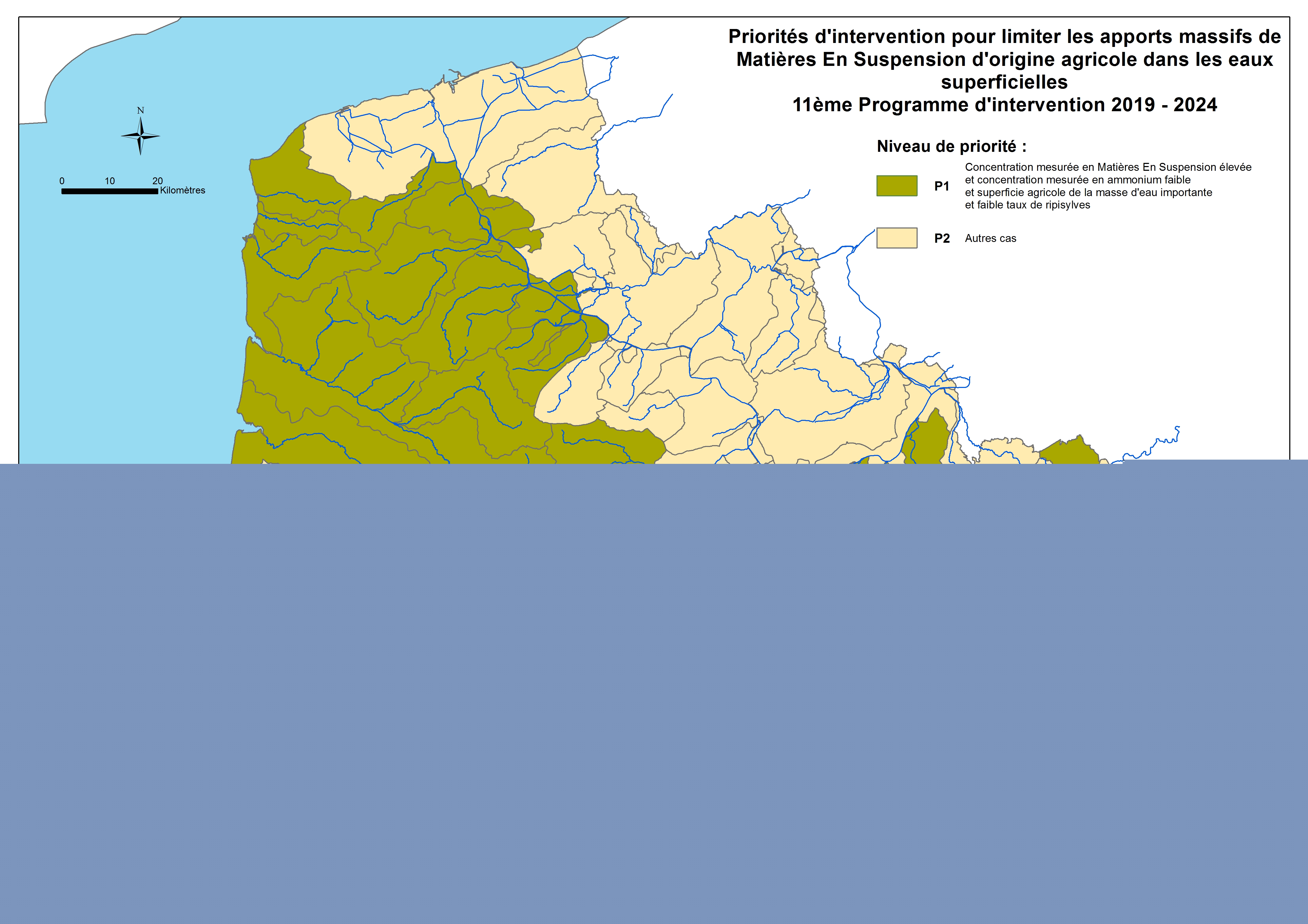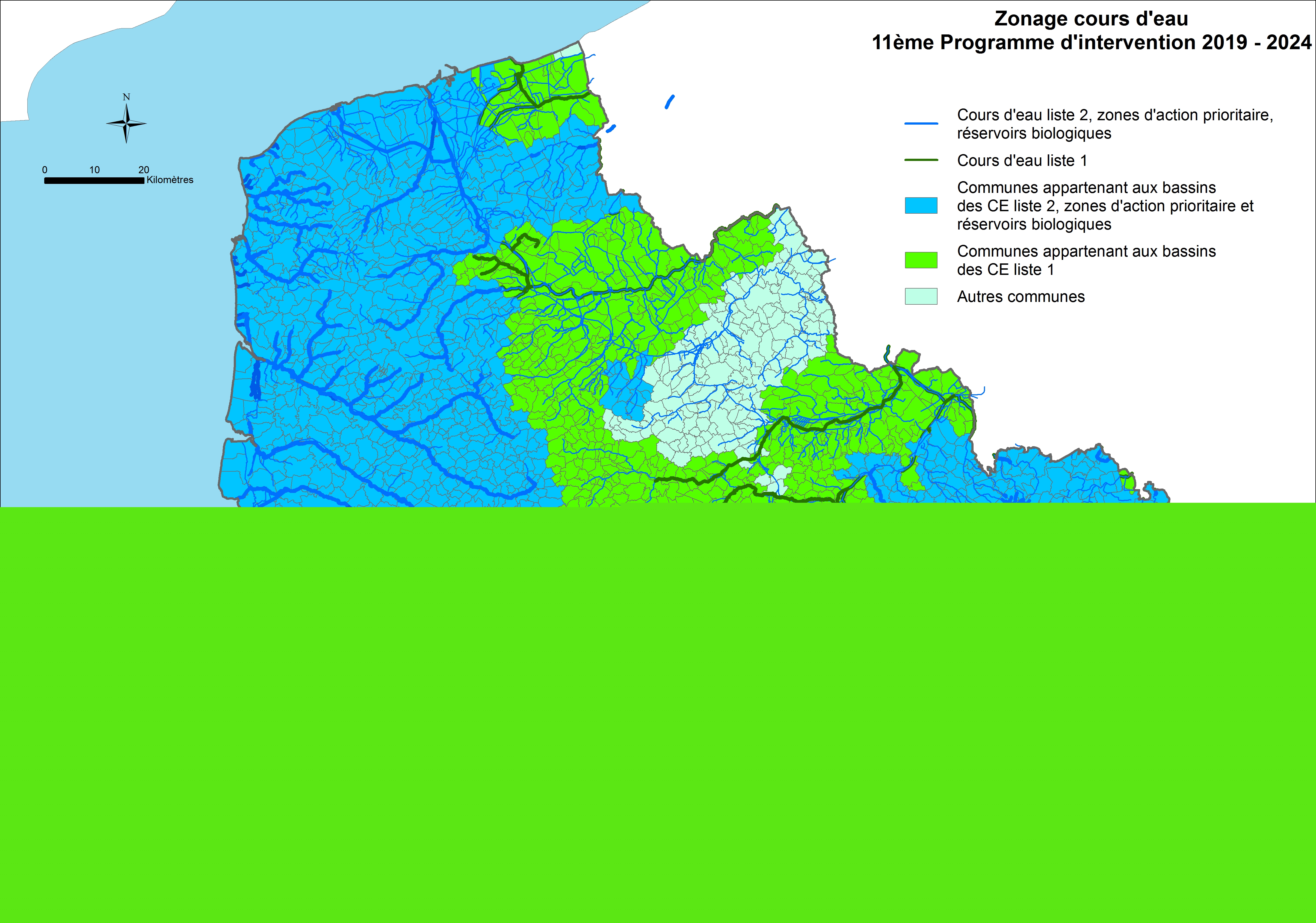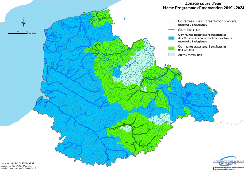 Différents zonages ont été définis pour orienter la mise en œuvre des politiques d’intervention de l’Agence au cours de la période 2019-2024. Cette carte représente le zonage identifiant les cours d'eau aux enjeux écologiques les plus forts du bassin Artois-Picardie.