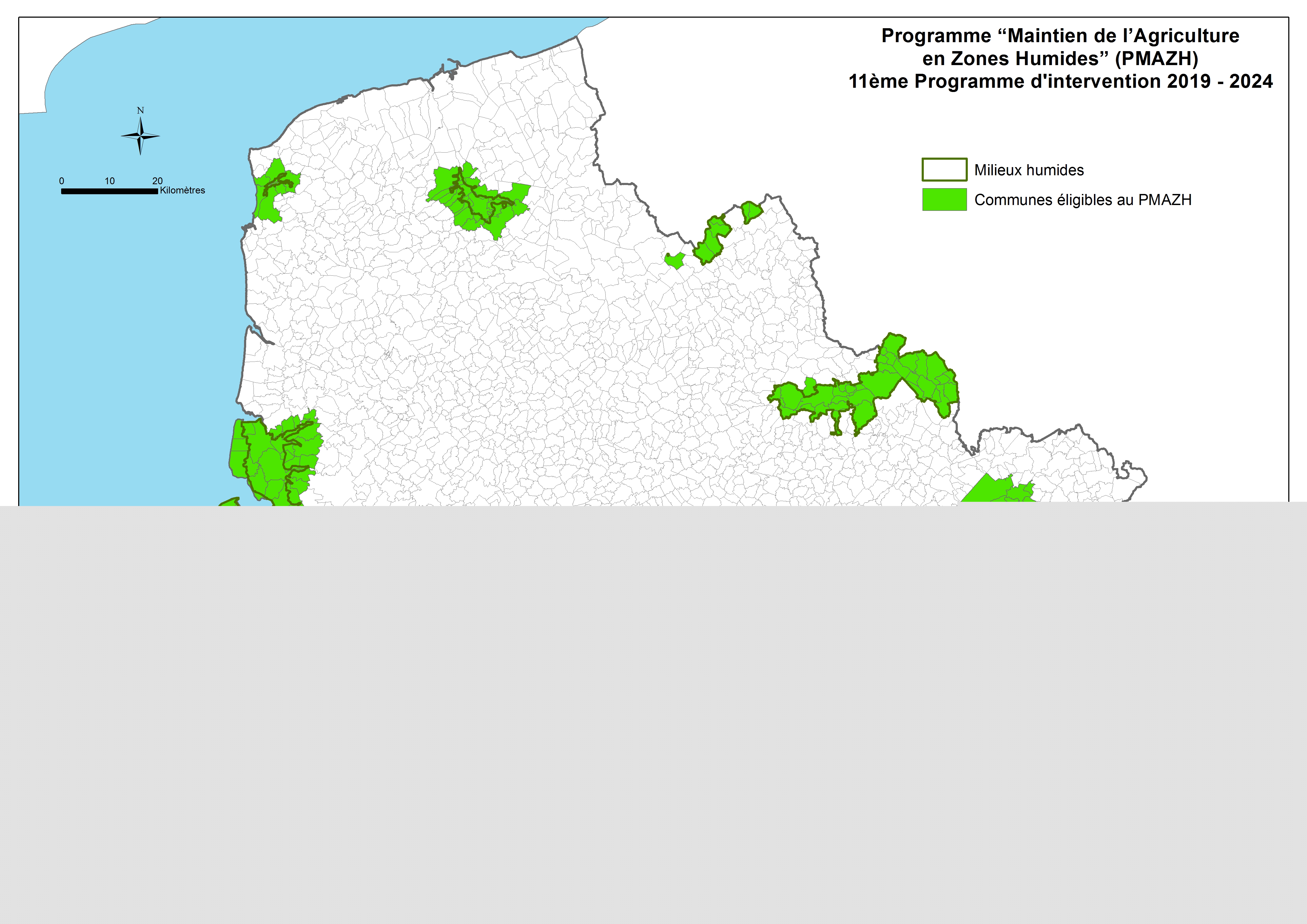Différents zonages ont été définis pour orienter la mise en œuvre des politiques d’intervention de l’Agence au cours de la période 2019-2024. Cette carte représente le zonage « Programme de Maintien de l’Agriculture en Zones Humides ».