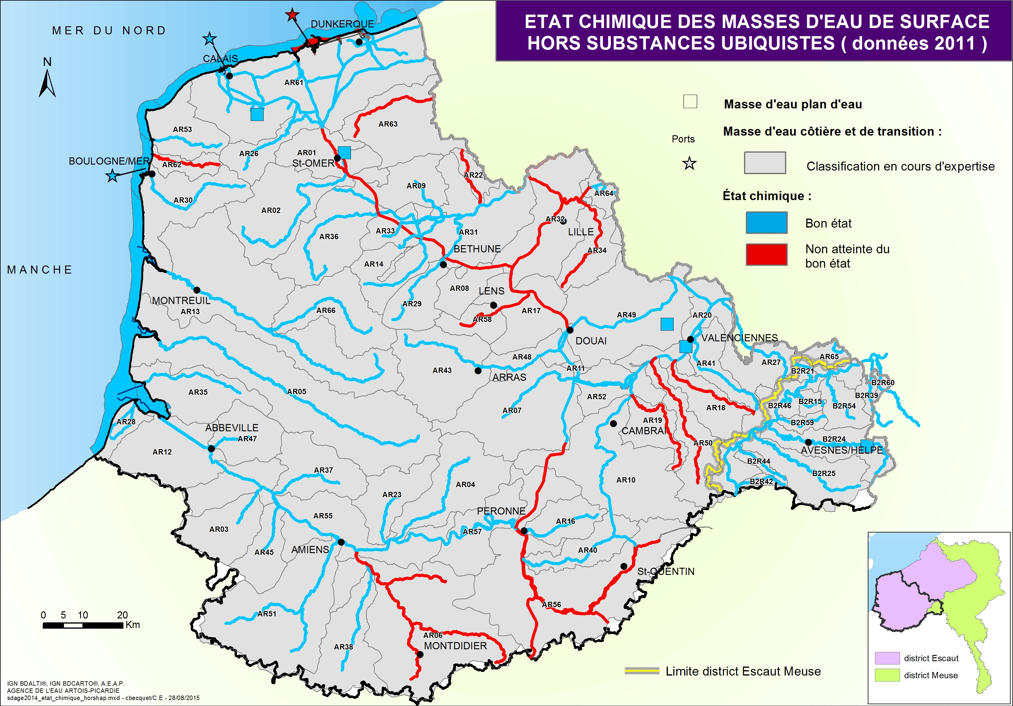 Le Schéma Directeur d'Aménagement et de Gestion des Eaux (SDAGE) fixe les objectifs d'atteinte du bon état des milieux aquatiques et les orientations pour atteindre ces objectifs. Cette carte issue du SDAGE 2016-2021 présente l'état chimique des masses d'eau de surface.
