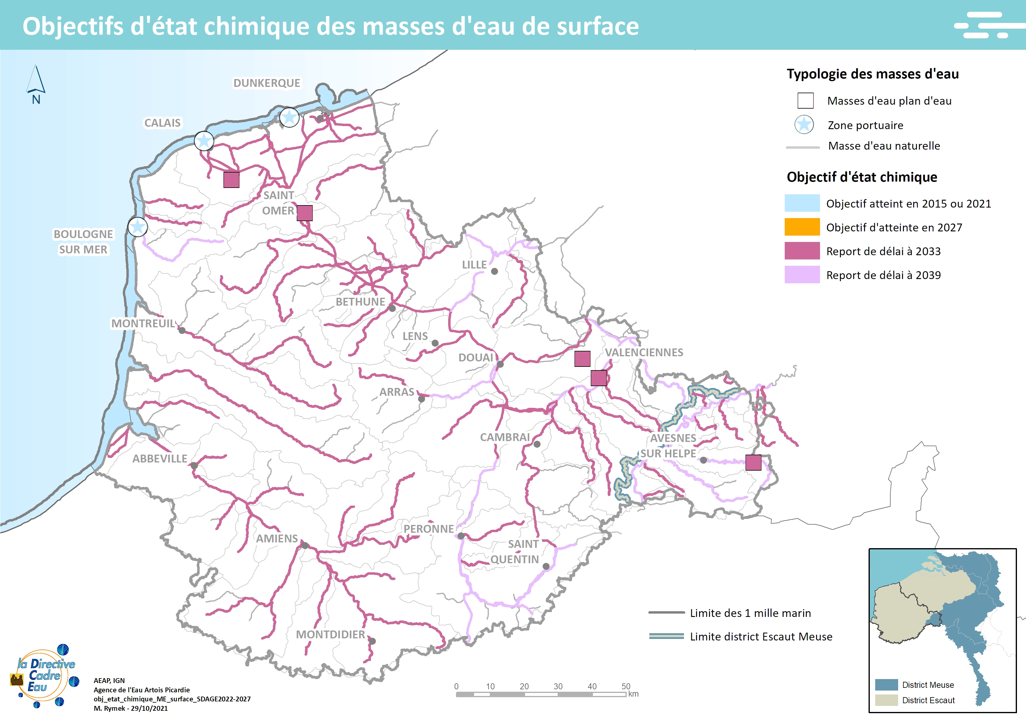 Cette carte issue du SDAGE 2022-2027 présente les objectifs d'état chimique des masses d'eau de surface