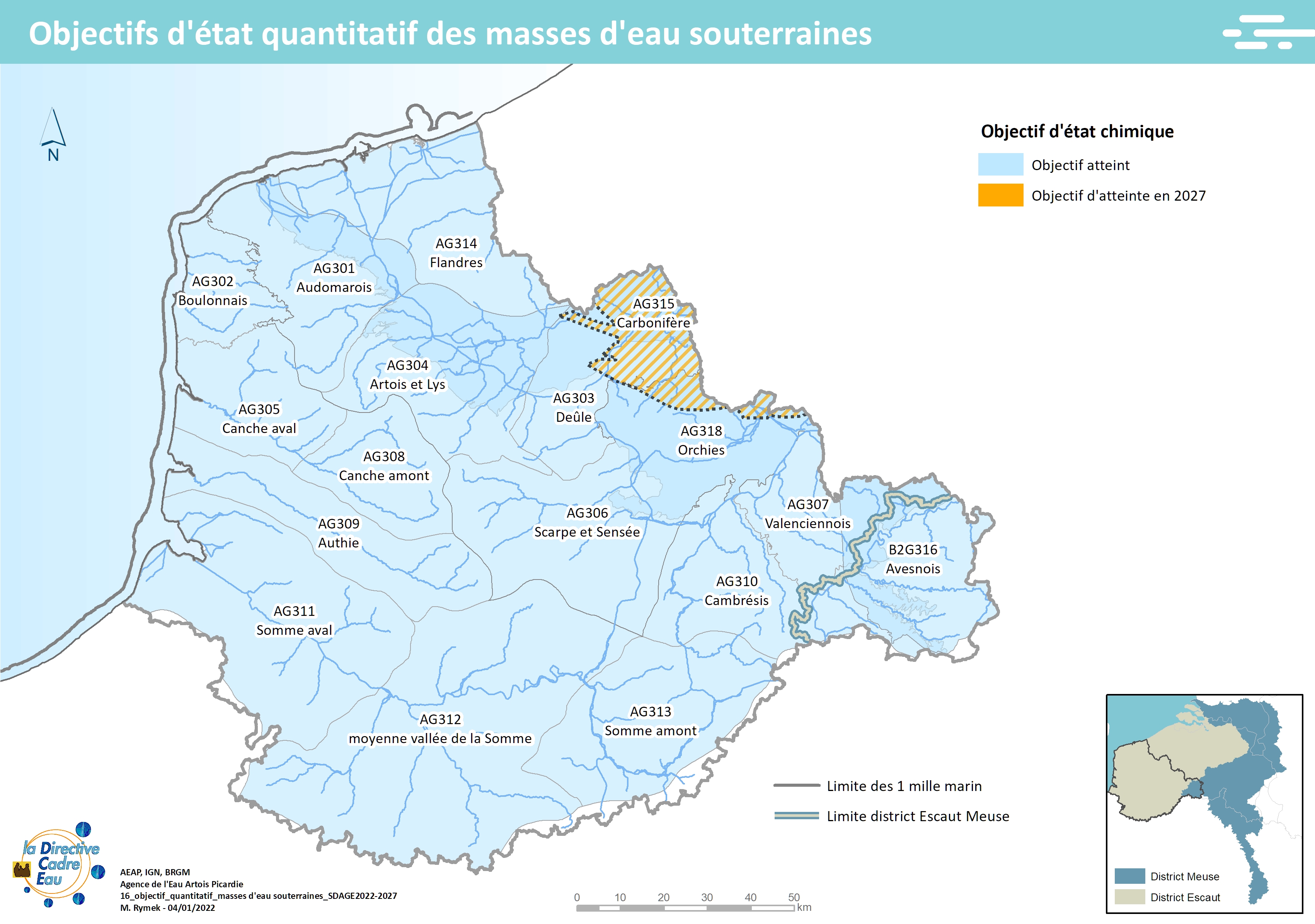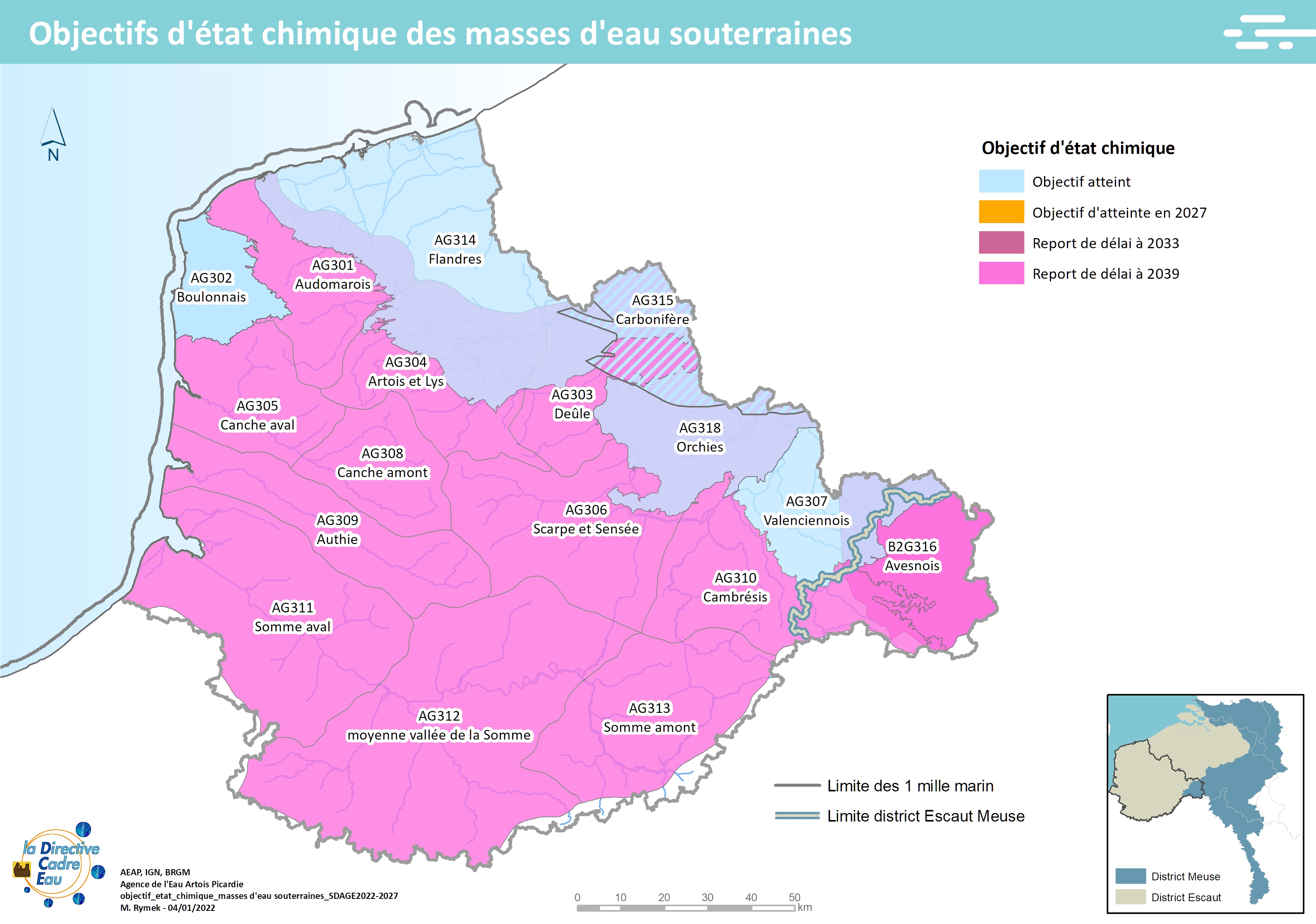 Cette carte issue du SDAGE 2022-2027 présente les objectifs d'état chimique des masses d'eau souterraines