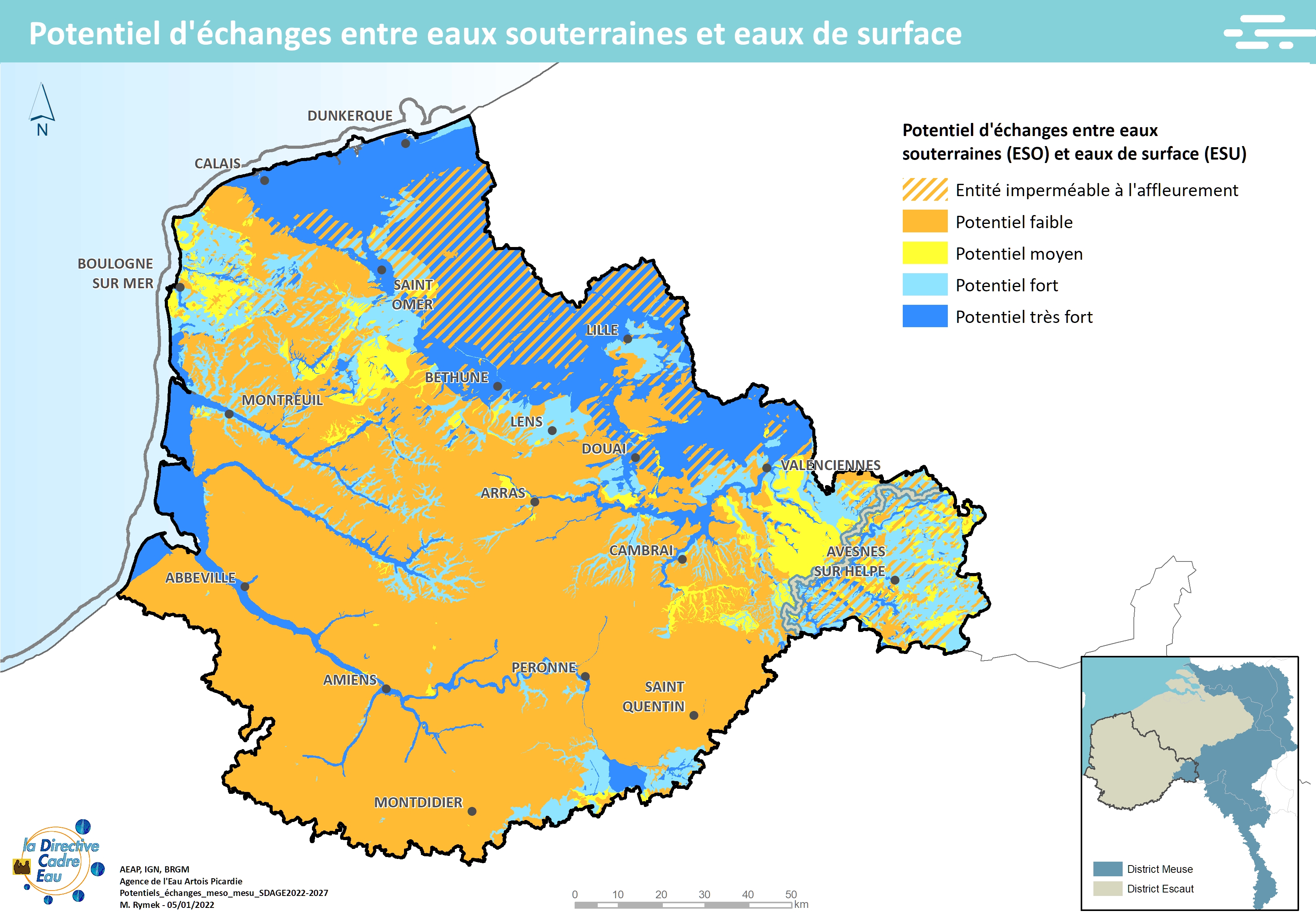 Cette carte issue du SDAGE 2022-2027 présente le potentiel d'échanges entre eaux souterraines et eaux de surface