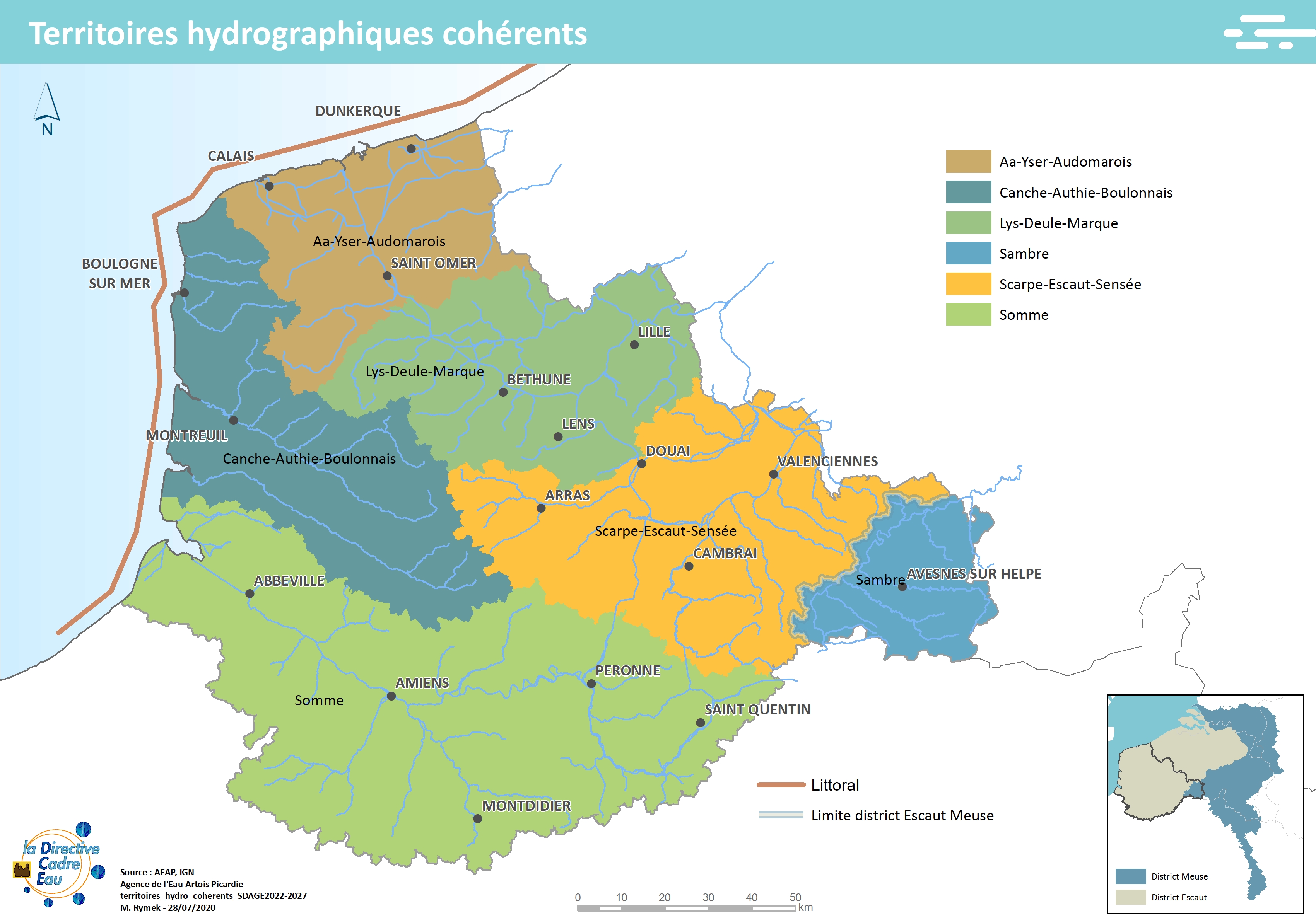 Cette carte issue du SDAGE 2022-2027 présente les territoires hydrographiques cohérents. Il s’agit des grands bassins versants identifiés par la Mission d’Appui Technique de Bassin (MATB) dans le cadre de la mise en place de la compétence GEMAPI.