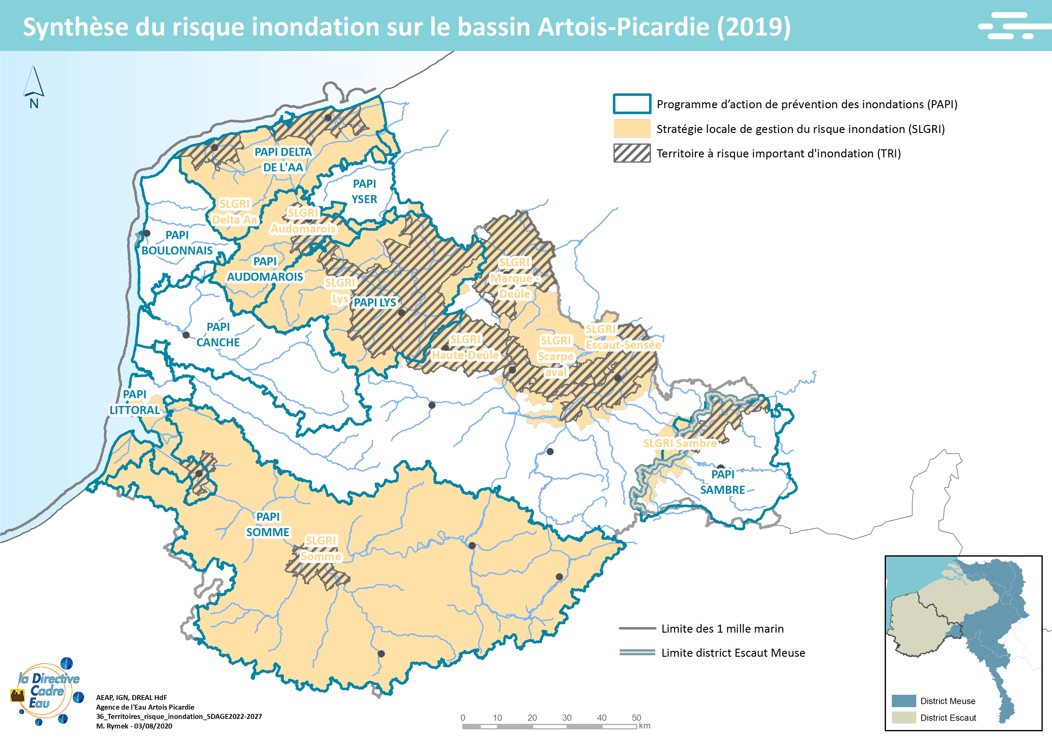 Cette carte issue du SDAGE 2022-2027 présente la synthèse du risque inondation sur le bassin Artois-Picardie (2019) : PAPI, TRI et SLGRI