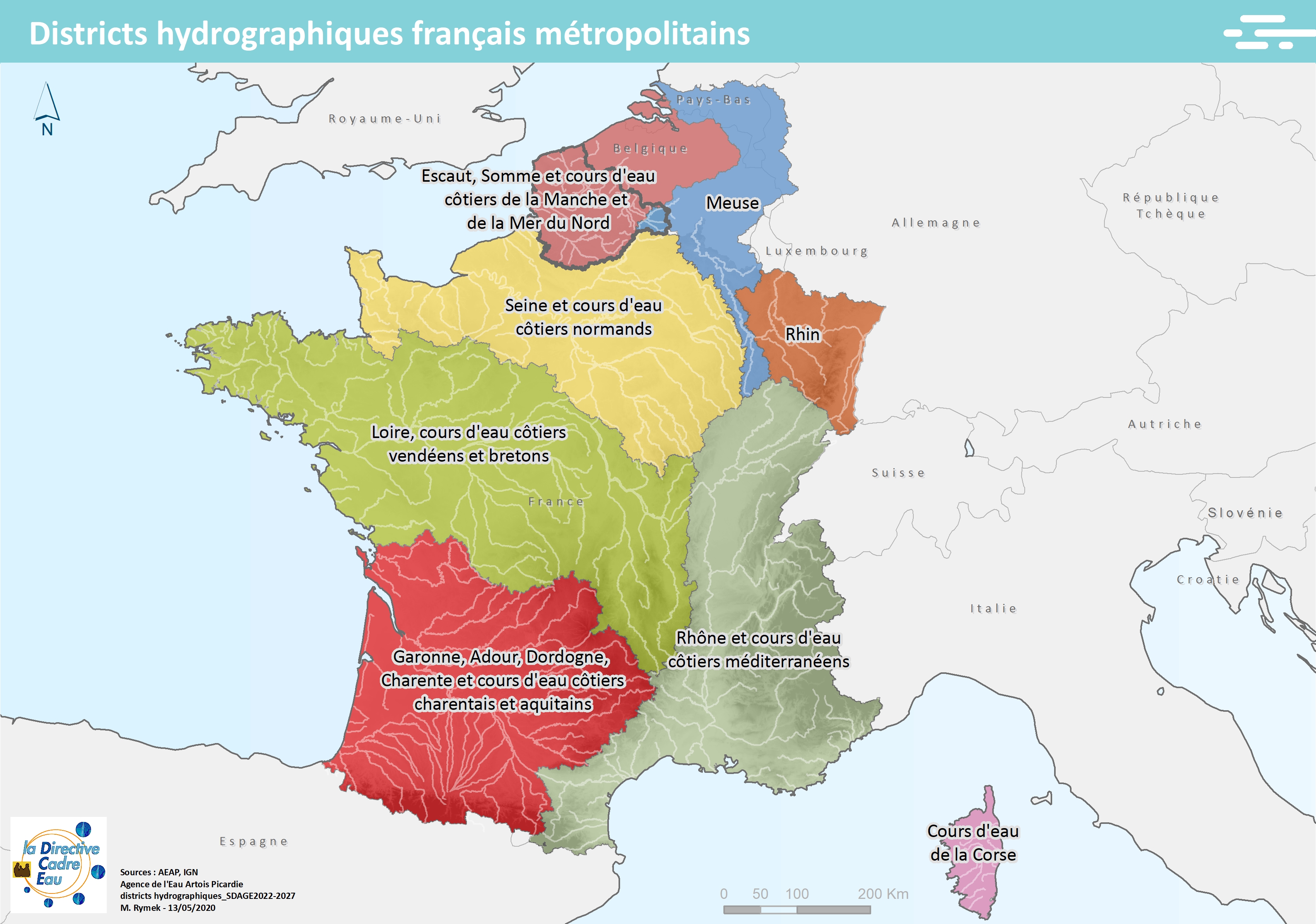 Cette carte issue du SDAGE 2022-2027 présente les districts hydrographiques français métropolitains