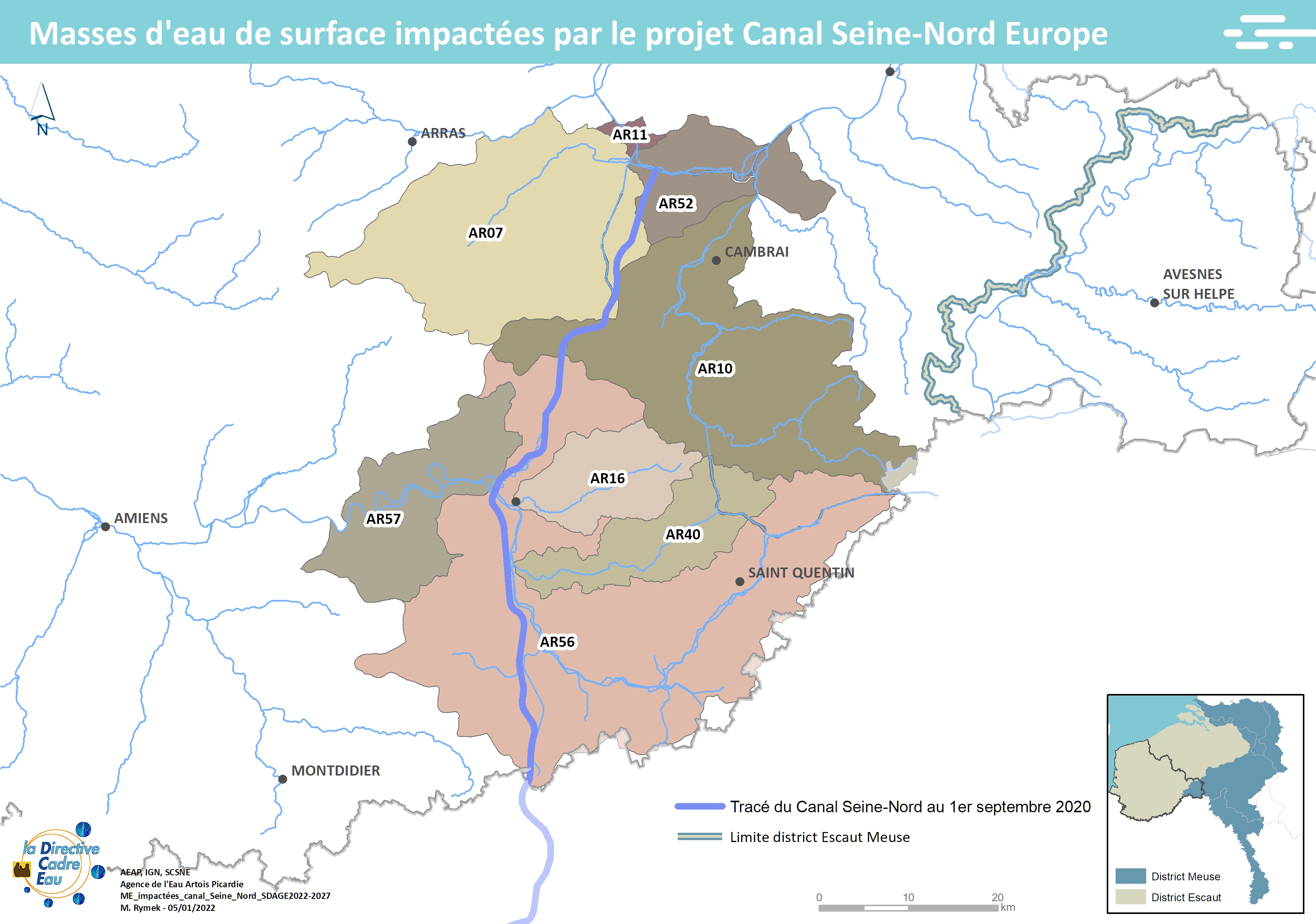 Cette carte issue du SDAGE 2022-2027 présente les masses d'eau de surface impactées par le projet Canal Seine-Nord Europe